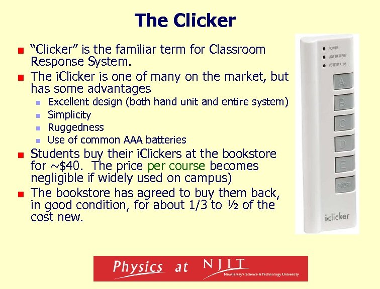 The Clicker “Clicker” is the familiar term for Classroom Response System. The i. Clicker is one of many on the market, but has some advantages n n Excellent design (both hand unit and entire system) Simplicity Ruggedness Use of common AAA batteries Students buy their i. Clickers at the bookstore for ~$40. The price per course becomes negligible if widely used on campus) The bookstore has agreed to buy them back, in good condition, for about 1/3 to ½ of the cost new.