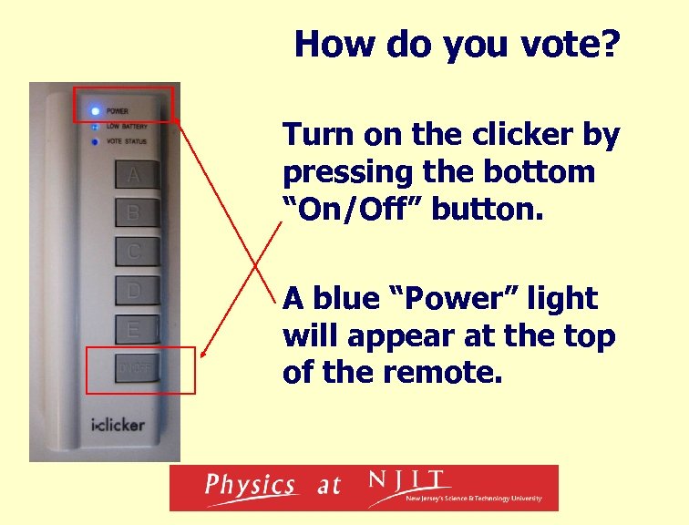 How do you vote? Turn on the clicker by pressing the bottom “On/Off” button. A blue “Power” light will appear at the top of the remote.