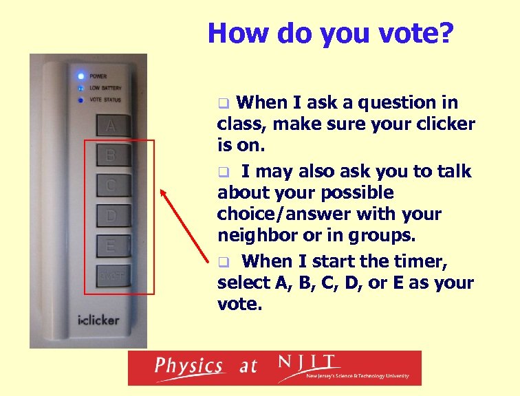 How do you vote? When I ask a question in class, make sure your clicker is on. q I may also ask you to talk about your possible choice/answer with your neighbor or in groups. q When I start the timer, select A, B, C, D, or E as your vote. q