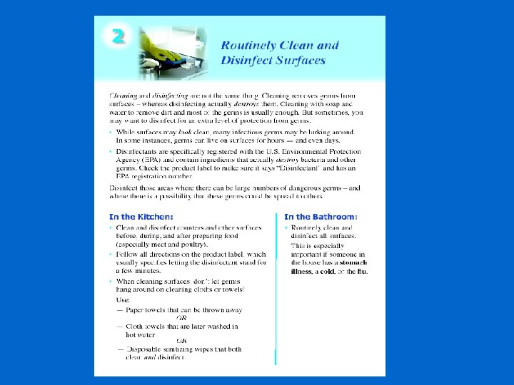 Suggestions: Disinfectants • Use disinfectants only when needed • Promote cleaning • Decide when and where disinfection needed • Use disinfectants correctly • Correct concentration, not more • 10 minute requirements? • Purchase safer disinfectants • Be aware of health effects