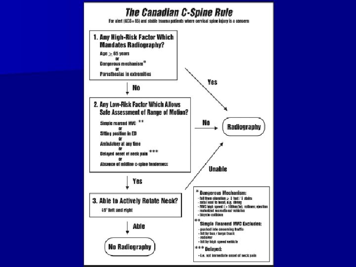 Canadian C-Spine rules Stiell IG, et al. “The Canadian C-spine rule for radiography in alert and stable trauma patients. ” JAMA. 2001 Oct 17; 286(15): 1841 -8. Prospective cohort study in 10 large EDs 20 standardized clinical findings were noted prior to radiography 8, 924 patients, including 151 (1. 7%) clinically significant CSI. Excluded children <16 and all patients with GCS <15