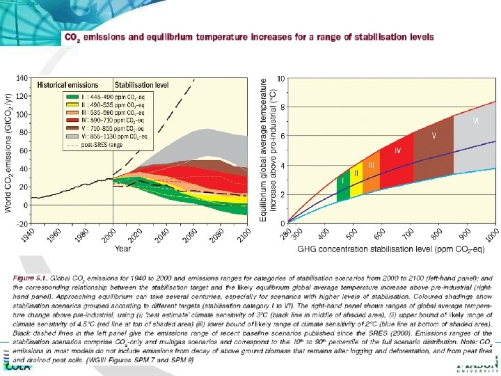 Global temperature changes estimated for SRES (bottom) and stabilisation (top)