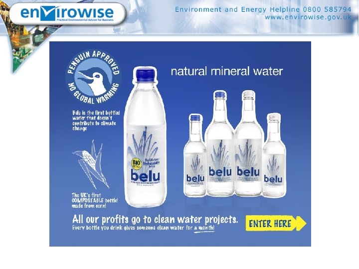 Burt's Potato Chips ü Raw material costs reduced by over £ 25, 000 (0. 6% of turnover) - flavorings ü Potential to reduce frying rejects by 90%, saving an estimated £ 175, 000/year ü Potential to use production waste as animal feed rather than sending it to landfill ü Potential to reduce water consumption by up to 25% ü Now using their ‘green’ image for PR etc