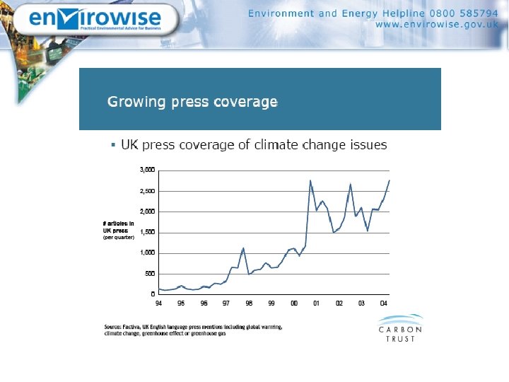 Environment & Energy Helpline § § § § Gateway to Envirowise Freephone 0800 585794 Any environmental question 2 hours free specialist advice No call limit (except for Consultants !) Signposting to other sources of information Requests for publications