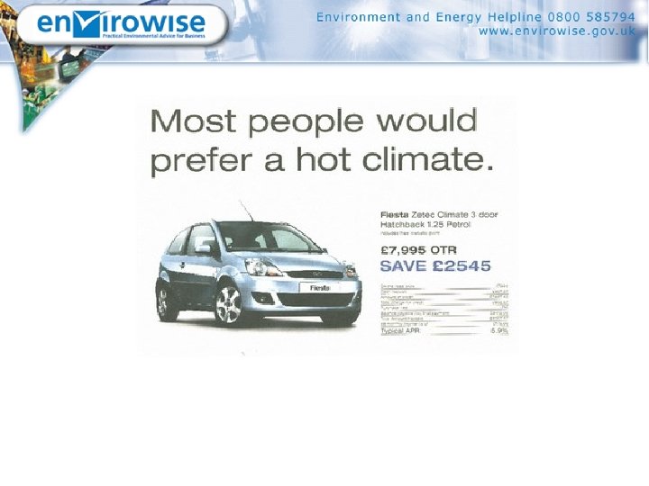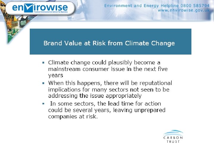 Who are Envirowise? § UK wide government funded programme led by industry and coordinated by DEFRA – programme value £ 14 M § Provide businesses with a range of free & confidential environmental services to improve their competitiveness & productivity § Primarily funded by the Business Resource efficiency & Waste (BREW) programme. § Complemented by WRAP , NISP and Carbon Trust