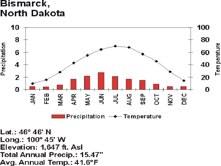 Average Jan and July Temperatures Seattle: High 47 F , Low 37 F July: High 75 F, Low 55 warmer winter, cooler summer= coastal locations Bismarck: High 23 F , Low 2 F July: High 84 F, Low 56 F Cooler winter, Warmer summer= inland locations From Weather channel: www. weather. com