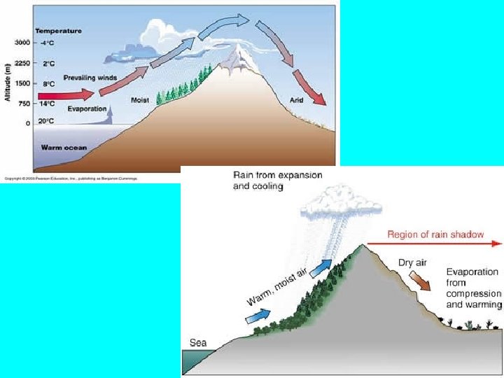 When air is forced to rise because it hits mountains, it will expand, cool, and condense - Windward side = a cool, moist climate. - Leeward side= a warm and dry climate