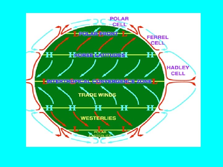 Doldrums: Along the equator the air is a constant warm temperature which is constantly rising. There is little or no lateral movement (no wind) Horse Latitudes: At about 30°latitude, the air stops moving toward the poles and sinks. So, once again there is little or no lateral movement (no wind) Trade Winds: Blow between the equator and 30°latitudes, both north and south. They blow from the northeast and the southeast toward the west. These constant steady winds are what early sailors depended on. Prevailing Westerlies: Between 30° to 60° latitudes north and south. They blow from the northwest and the southwest toward the poles in an easterly curve. Polar Easterlies: Blow cold air away from the poles – They meet the prevailing westerlies at 60° latitudes and produce the polar front. This mixing of cold and hot air has a major effect on weather in the U. S. Jet Streams: Upper troposphere to lower stratosphere (about 10 km up) Bands of high speed winds. Blow from west to east in a wavy pattern