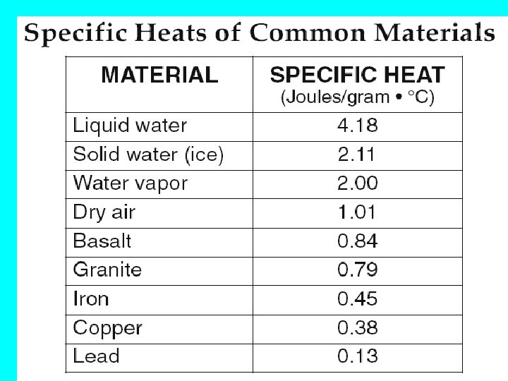 Specific heat • The ability to resist being heated – Low specific heat = heat up and cool down fast – High specific heat = heat up and cool down slowly