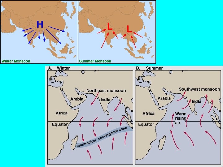 Monsoons • A monsoon is a seasonal change in the direction of the prevailing, or strongest, winds of a region. • Monsoons cause wet and dry seasons • Monsoons are most often associated with the Indian Ocean. • Monsoons always blow from cold to warm regions.