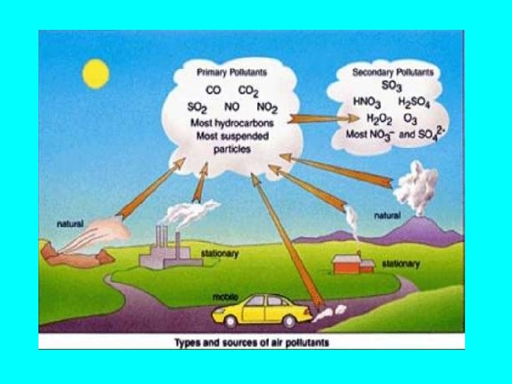Acid Rain • Acid rain results when sulfur dioxide (SO 2) and nitrogen oxides (NOX) are emitted into the atmosphere and transported by wind air currents. • The SO 2 and NOX react with water, oxygen and other chemicals to form sulfuric and nitric acids. These then mix with water and other materials before falling to the ground. • While a small portion of the SO 2 and NOX that cause acid rain is from natural sources such as volcanoes • Most of it comes from the burning of fossil fuels. The major sources of SO 2 and NOX in the atmosphere are: – Burning of fossil fuels to generate electricity. Two thirds of SO 2 and one fourth of NOX in the atmosphere come from electric power generators. – Vehicles and heavy equipment. – Manufacturing, oil refineries and other industries
