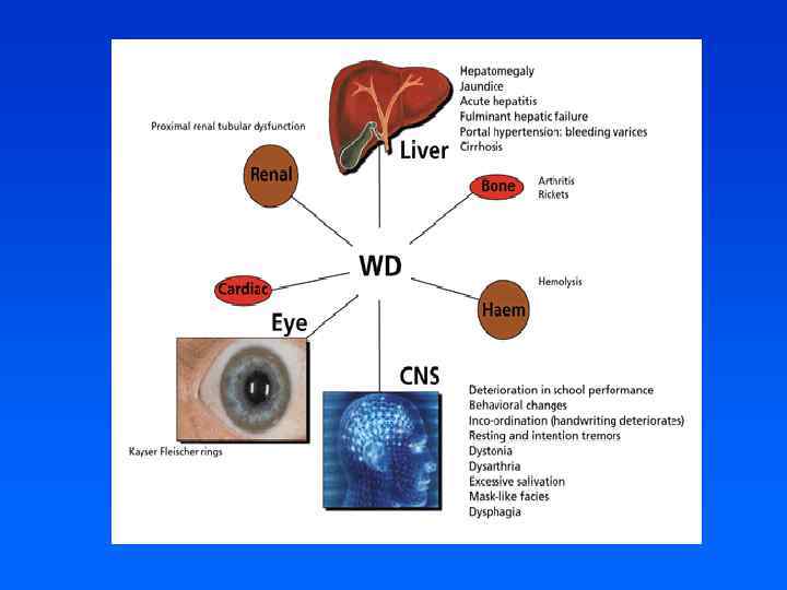 Wilson’s Disease • Wilson disease is a disorder of copper transport resulting in copper deposition in multiple organs • Clinical manifestations may be severe, but the disease is treatable if diagnosed early