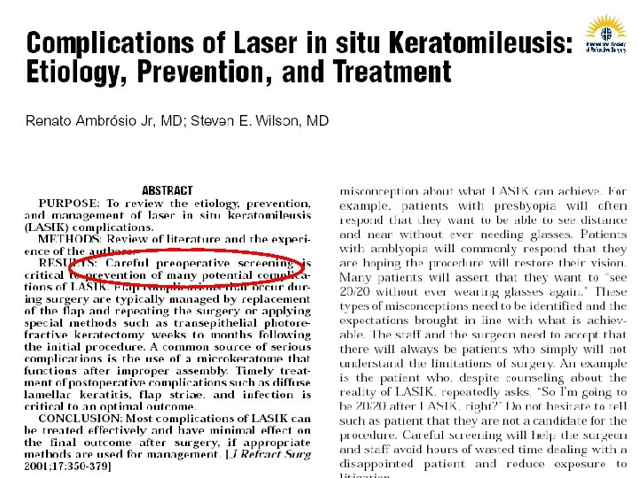 Goals of the Preop exam in refractive surgery Screening refractive candidates n Patient education n Surgical Planning n R. Ambrósio Jr, M. D.