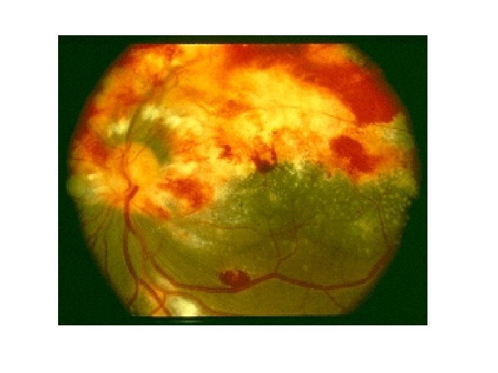 CMV • Typically does not cause disease until CD 4 <50 • Manifestations in HIV patients: – Retinitis • Unilateral or bilateral visual disturbance • Confirmed by retina exam showing “scrambled eggs & ketchup” (exudates & hemorrhages) – GI disease • Esophagitis • Colitis with watery diarrhea, abdominal pain • Neurologic disorders