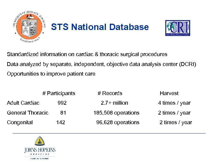 STS National Database Standardized information on cardiac & thoracic surgical procedures Data analyzed by separate, independent, objective data analysis center (DCRI) Opportunities to improve patient care # Participants # Records Harvest Adult Cardiac 992 2. 7+ million 4 times / year General Thoracic 81 185, 508 operations 2 times / year Congenital 96, 628 operations 2 times / year 142