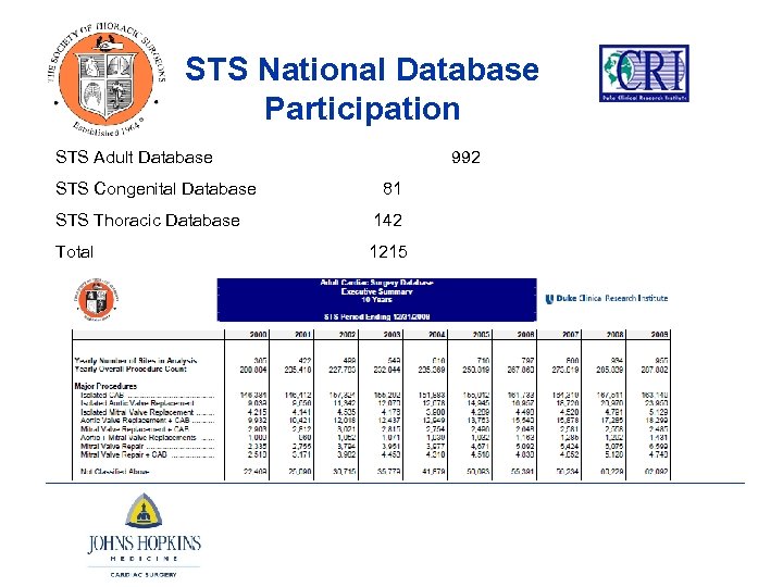 STS National Database Participation STS Adult Database 992 STS Congenital Database 81 STS Thoracic Database 142 Total 1215