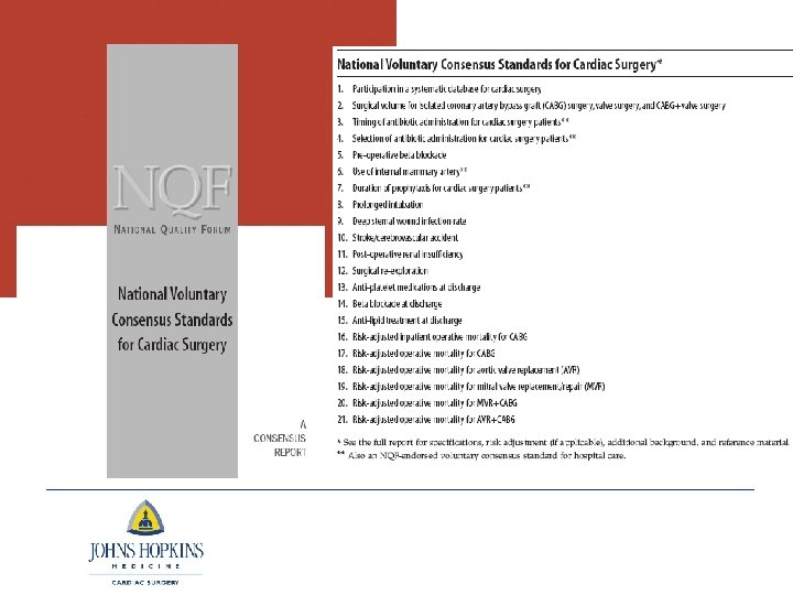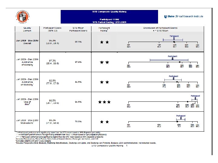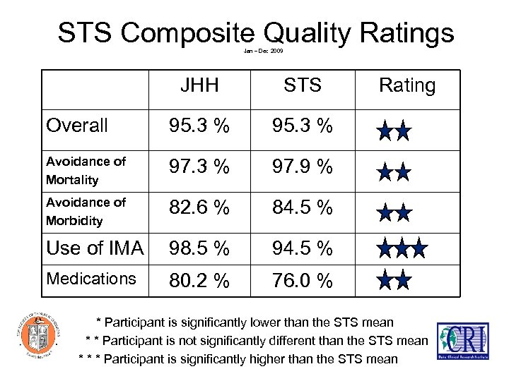 STS Composite Quality Ratings Jan – Dec 2009 JHH STS Overall 95. 3 % Avoidance of Mortality 97. 3 % 97. 9 % Avoidance of Morbidity 82. 6 % 84. 5 % Use of IMA 98. 5 % 94. 5 % Medications 80. 2 % Rating 76. 0 % * Participant is significantly lower than the STS mean * * Participant is not significantly different than the STS mean * * * Participant is significantly higher than the STS mean