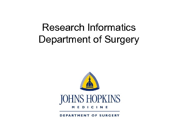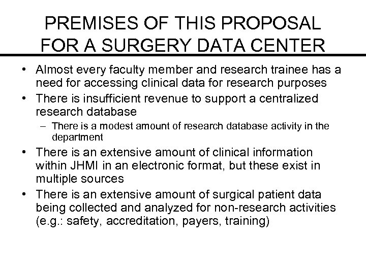PREMISES OF THIS PROPOSAL FOR A SURGERY DATA CENTER • Almost every faculty member and research trainee has a need for accessing clinical data for research purposes • There is insufficient revenue to support a centralized research database – There is a modest amount of research database activity in the department • There is an extensive amount of clinical information within JHMI in an electronic format, but these exist in multiple sources • There is an extensive amount of surgical patient data being collected analyzed for non-research activities (e. g. : safety, accreditation, payers, training)