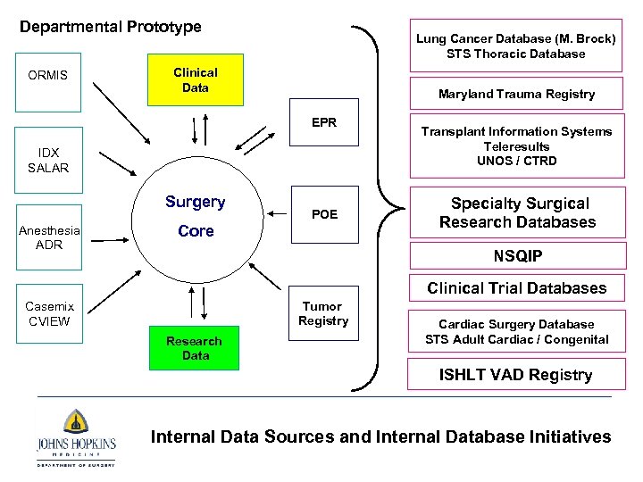 Departmental Prototype ORMIS Lung Cancer Database (M. Brock) STS Thoracic Database Clinical Data Maryland Trauma Registry EPR IDX SALAR Surgery Anesthesia ADR POE Core Transplant Information Systems Teleresults UNOS / CTRD Specialty Surgical Research Databases NSQIP Clinical Trial Databases Tumor Registry Casemix CVIEW Research Data Cardiac Surgery Database STS Adult Cardiac / Congenital ISHLT VAD Registry Internal Data Sources and Internal Database Initiatives