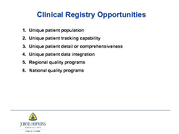 Clinical Registry Opportunities 1. Unique patient population 2. Unique patient tracking capability 3. Unique patient detail or comprehensiveness 4. Unique patient data integration 5. Regional quality programs 6. National quality programs