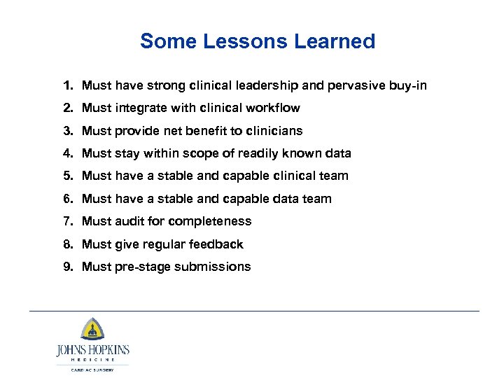 Some Lessons Learned 1. Must have strong clinical leadership and pervasive buy-in 2. Must integrate with clinical workflow 3. Must provide net benefit to clinicians 4. Must stay within scope of readily known data 5. Must have a stable and capable clinical team 6. Must have a stable and capable data team 7. Must audit for completeness 8. Must give regular feedback 9. Must pre-stage submissions