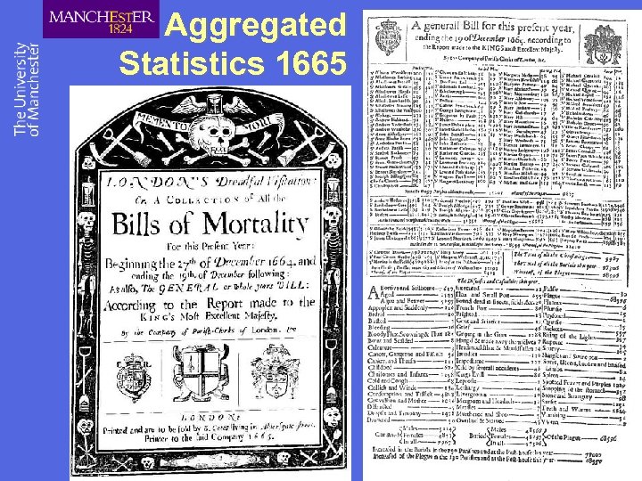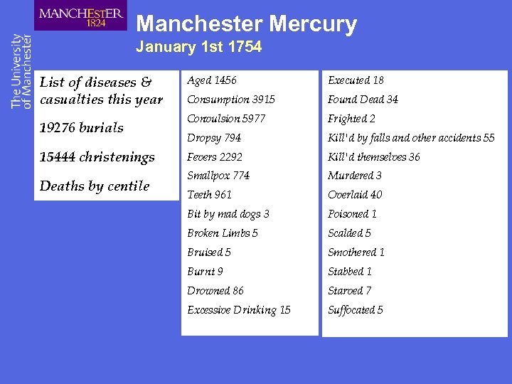 Manchester Mercury January 1 st 1754 List of diseases & casualties this year 19276 burials 15444 christenings Deaths by centile Aged 1456 Executed 18 Consumption 3915 Found Dead 34 Convulsion 5977 Frighted 2 Dropsy 794 Kill'd by falls and other accidents 55 Fevers 2292 Kill'd themselves 36 Smallpox 774 Murdered 3 Teeth 961 Overlaid 40 Bit by mad dogs 3 Poisoned 1 Broken Limbs 5 Scalded 5 Bruised 5 Smothered 1 Burnt 9 Stabbed 1 Drowned 86 Starved 7 Excessive Drinking 15 Suffocated 5