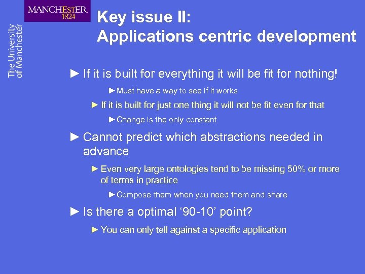 Key issue II: Applications centric development ► If it is built for everything it will be fit for nothing! ►Must have a way to see if it works ► If it is built for just one thing it will not be fit even for that ►Change is the only constant ► Cannot predict which abstractions needed in advance ► Even very large ontologies tend to be missing 50% or more of terms in practice ►Compose them when you need them and share ► Is there a optimal ‘ 90 -10’ point? ► You can only tell against a specific application