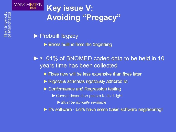 Key issue V: Avoiding “Pregacy” ► Prebuilt legacy ► Errors built in from the beginning ► ≤. 01% of SNOMED coded data to be held in 10 years time has been collected ► Fixes now will be less expensive than fixes later ► Rigorous schemas rigorously adhered to ► Conformance and Regression testing ►Cannot depend on people to do it right ►Must be formally verifiable ► It’s software - Let’s have some basic software engineering!