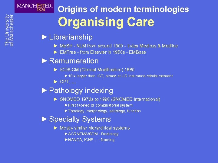 Origins of modern terminologies Organising Care ► Librarianship ► Me. SH - NLM from around 1900 - Index Medicus & Medline ► EMTree - from Elsevier in 1950 s - EMBase ► Remumeration ► ICD 9 -CM (Clinical Modification) 1980 ► 10 x larger than ICD; aimed at US insurance reimbursement ► CPT, … ► Pathology indexing ► SNOMED 1970 s to 1990 (SNOMED International) ►First faceted or combinatorial system ►Topology, morphology, aetiology, function ► Specialty Systems ► Mostly similar hierarchical systems ►ACRNEMA/SDM - Radiology ►NANDA, ICNP… - Nursing