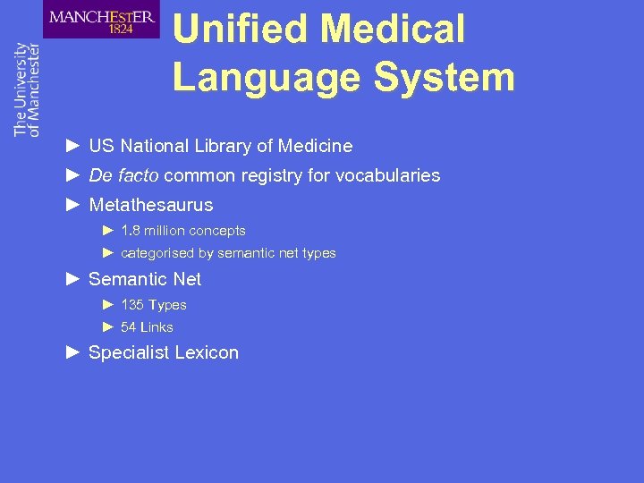 Unified Medical Language System ► US National Library of Medicine ► De facto common registry for vocabularies ► Metathesaurus ► 1. 8 million concepts ► categorised by semantic net types ► Semantic Net ► 135 Types ► 54 Links ► Specialist Lexicon