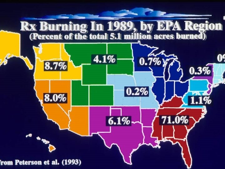Primary Reasons for Rx Burning in U. S. · Fire hazard reduction……. . 64. 1 % · Silviculture…………………. 17. 9 % · Vegetation management…. . 2. 5 % · Range improvement………. . 1. 2 % · Wildlife habitat……………… 9. 8 % · Others…………… 4. 5 % From Peterson et al. (1993)