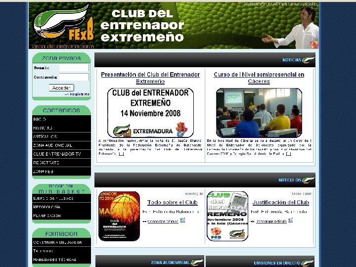 Club del Entrenador de Baloncesto Extremeño ¿Por qué el C. E. Ex? ü Utilizar las últimas tecnologías para un mejor proceso de enseñanza – aprendizaje ü Llegar a todos los rincones de nuestra Comunidad Autónoma, por muy pequeño que sea el sitio o lugar, la formación es la misma. ü Relaciones y comunicación entre técnicos y responsables en debates o temas de interés general.