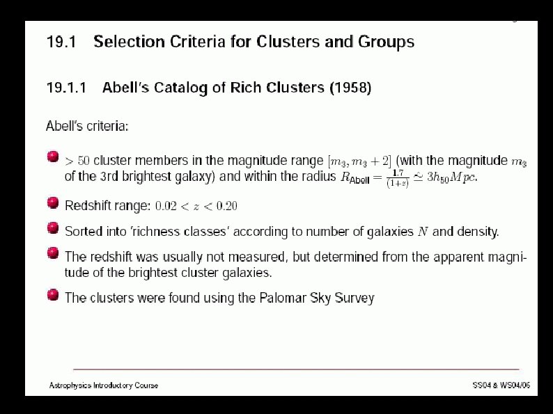 Zwicky et al. (1961 -1968) Zwicky catalogued about 10000 clusters by eye Because a less rigorous cluster definition was used, this catalogue is not as complete or homogeneous as Abell's An Shectman (1985) An automated computer procedure was used to identify 646 clusters from the Lick galaxy survey