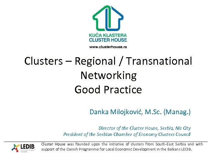Clusters – Regional / Transnational Networking Good Practice Danka Milojković, M. Sc. (Manag. ) Director of the Cluster House, Serbia, Nis City President of the Serbian Chamber of Economy Clusters Council Cluster House was founded upon the initiative of clusters from South-East Serbia and with support of the Danish Programme for Local Economic Development in the Balkans LEDIB.