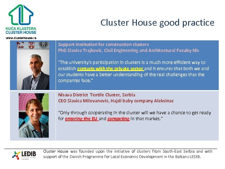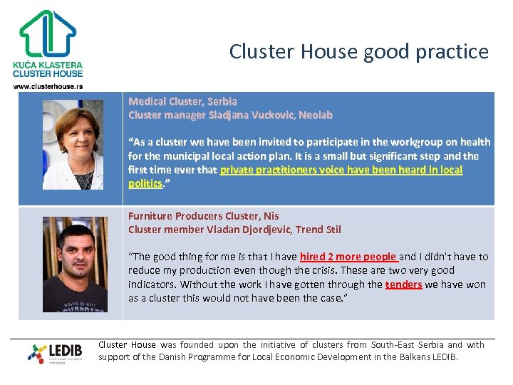 Cluster House good practice Medical Cluster, Serbia Cluster manager Sladjana Vuckovic, Neolab “As a cluster we have been invited to participate in the workgroup on health for the municipal local action plan. It is a small but significant step and the first time ever that private practitioners voice have been heard in local politics. ” Furniture Producers Cluster, Nis Cluster member Vladan Djordjevic, Trend Stil “The good thing for me is that I have hired 2 more people and I didn't have to reduce my production even though the crisis. These are two very good indicators. Without the work I have gotten through the tenders we have won as a cluster this would not have been the case. ” Cluster House was founded upon the initiative of clusters from South-East Serbia and with support of the Danish Programme for Local Economic Development in the Balkans LEDIB.