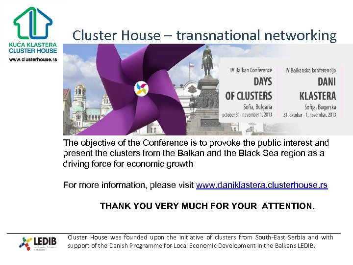 Cluster House – transnational networking The objective of the Conference is to provoke the public interest and present the clusters from the Balkan and the Black Sea region as a driving force for economic growth For more information, please visit www. daniklastera. clusterhouse. rs THANK YOU VERY MUCH FOR YOUR ATTENTION. Cluster House was founded upon the initiative of clusters from South-East Serbia and with support of the Danish Programme for Local Economic Development in the Balkans LEDIB.