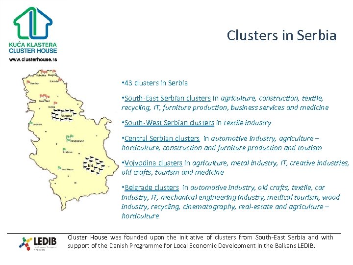 Cluster House, South East Serbia • founded upon the initiative of seven clusters from South-East Serbia and with technical support of the Danish Programme LEDIB, in January 2011 • unique business development organization for support to clusters, associations and SMEs • coordinator of the Balkan Clusters Network The CLUSTER HOUSE objective: support cluster initiatives, inform clusters and their members, and motivate development, networking and promotion of clusters in Serbia and in the Balkan Cluster House was founded upon the initiative of clusters from South-East Serbia and with support of the Danish Programme for Local Economic Development in the Balkans LEDIB.