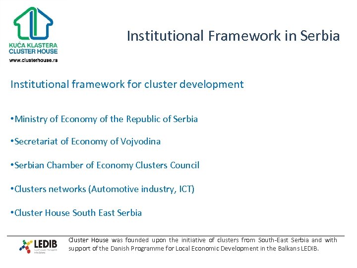 Institutional Framework in Serbia Institutional framework for cluster development • Ministry of Economy of the Republic of Serbia • Secretariat of Economy of Vojvodina • Serbian Chamber of Economy Clusters Council • Clusters networks (Automotive industry, ICT) • Cluster House South East Serbia Cluster House was founded upon the initiative of clusters from South-East Serbia and with support of the Danish Programme for Local Economic Development in the Balkans LEDIB.
