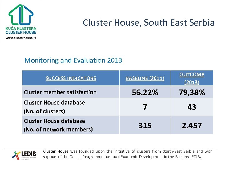 Cluster House, South East Serbia Monitoring and Evaluation 2013 SUCCESS INDICATORS Cluster member satisfaction Cluster House database (No. of clusters) Cluster House database (No. of network members) BASELINE (2011) OUTCOME (2013) 56. 22% 79, 38% 7 43 315 2. 457 Cluster House was founded upon the initiative of clusters from South-East Serbia and with support of the Danish Programme for Local Economic Development in the Balkans LEDIB.
