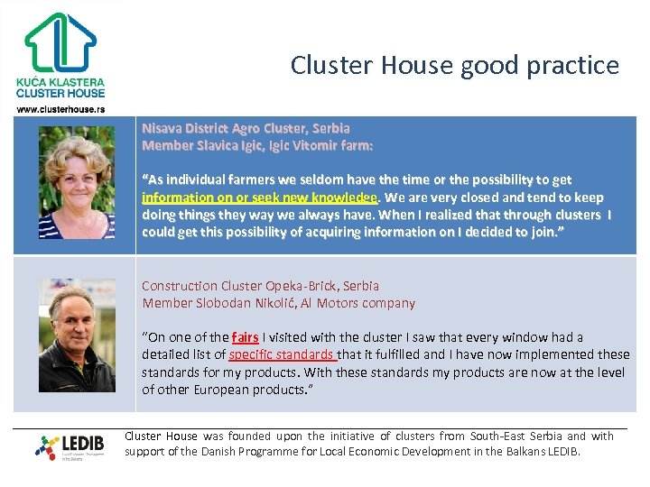 Cluster House good practice Nisava District Agro Cluster, Serbia Member Slavica Igic, Igic Vitomir farm: “As individual farmers we seldom have the time or the possibility to get information on or seek new knowledge. We are very closed and tend to keep doing things they way we always have. When I realized that through clusters I could get this possibility of acquiring information on I decided to join. ” Construction Cluster Opeka-Brick, Serbia Member Slobodan Nikolić, Al Motors company “On one of the fairs I visited with the cluster I saw that every window had a detailed list of specific standards that it fulfilled and I have now implemented these standards for my products. With these standards my products are now at the level of other European products. ” Cluster House was founded upon the initiative of clusters from South-East Serbia and with support of the Danish Programme for Local Economic Development in the Balkans LEDIB.