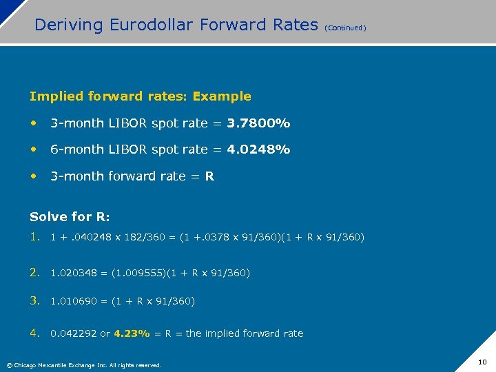 Deriving Eurodollar Forward Rates Implied forward rates • Eurodollar futures reflect market expectations of forward 3 -month rates. An implied forward rate indicates approximately where short-term rates may be expected to be sometime in the future. The following formula provides a guideline for calculating a 3 -month rate, three months forward: 1 + 6 mth spot rate x 182/360 = (1 + 3 mth spot rate x 91/360) x (1 + 3 mth fwd rate x 91/360) © Chicago Mercantile Exchange Inc. All rights reserved. 9