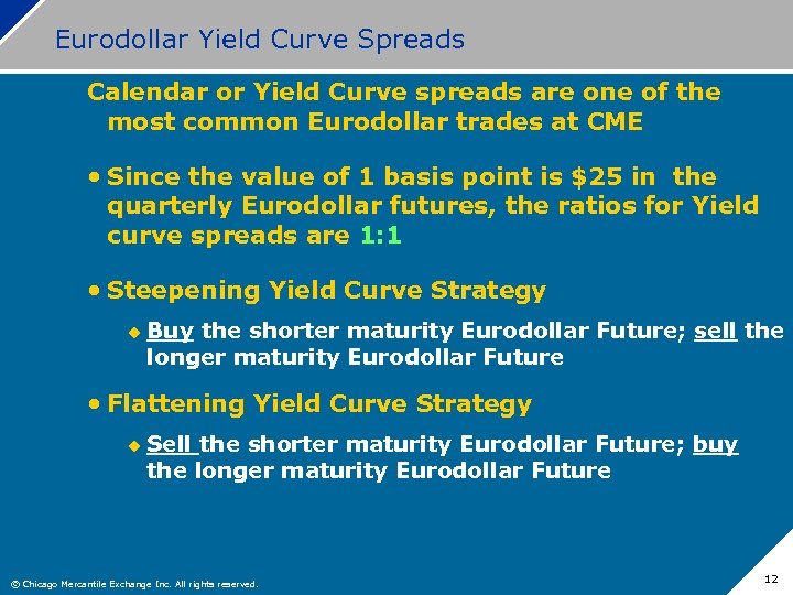 Deriving Eurodollar Forward Rates (Continued) Implied forward rates: -Day Rate 90 180 - Implied Day Rate Forward Rate Steep Yield Curve 3. 75 % 4. 00 % 4. 21 % Inverted Yield Curve 3. 75 % 3. 50 % 3. 22 % Flat Yield Curve 3. 75 % 3. 71 % © Chicago Mercantile Exchange Inc. All rights reserved. 11