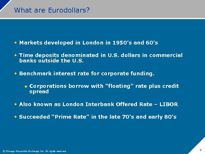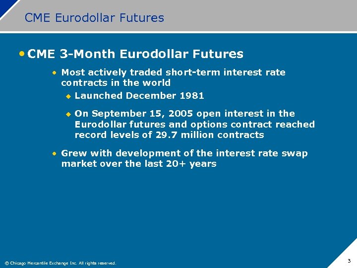 What are Eurodollars? • Markets developed in London in 1950’s and 60’s • Time deposits denominated in U. S. dollars in commercial banks outside the U. S. • Benchmark interest rate for corporate funding. u Corporations borrow with “floating” rate plus credit spread • Also known as London Interbank Offered Rate – LIBOR • Succeeded “Prime Rate” in the late 70’s and early 80’s © Chicago Mercantile Exchange Inc. All rights reserved. 2
