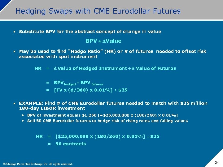 Hedging Swaps with CME Eurodollar Futures Matching cash flows … • Balance changes in value of hedged item with change in value of futures contract D Value of Hedged Instrument » D Value of Futures Position • BUT … need to measure changes in value with use of “basis point value” (BPV) • BPV measures change in the value of an instrument in response to a one basis point (0. 01%) change in yield • BPV of one CME Eurodollar futures (BPVfutures) = $25. 00 BPVfutures = FV x (d/360) x 0. 01% = $1, 000 x (90/360) x 0. 01% = $25. 00 © Chicago Mercantile Exchange Inc. All rights reserved. 33