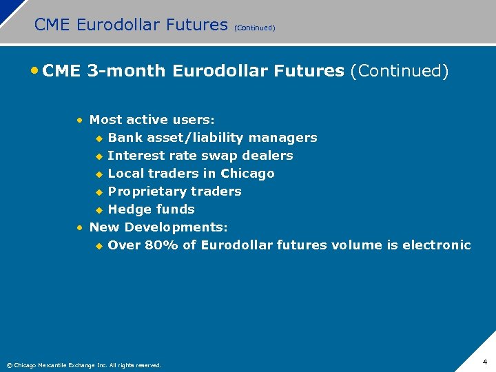 CME Eurodollar Futures • CME 3 -Month Eurodollar Futures · Most actively traded short-term interest rate contracts in the world u Launched December 1981 u On September 15, 2005 open interest in the Eurodollar futures and options contract reached record levels of 29. 7 million contracts · Grew with development of the interest rate swap market over the last 20+ years © Chicago Mercantile Exchange Inc. All rights reserved. 3