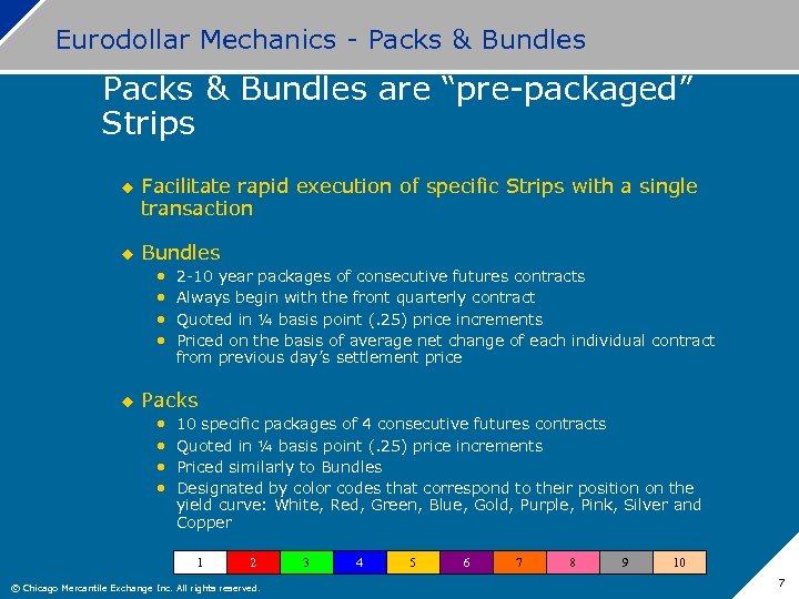 Eurodollar Mechanics - Packs & Bundles are “pre-packaged” Strips u u Facilitate rapid execution of specific Strips with a single transaction Bundles · · u 2 -10 year packages of consecutive futures contracts Always begin with the front quarterly contract Quoted in ¼ basis point (. 25) price increments Priced on the basis of average net change of each individual contract from previous day’s settlement price Packs · · 10 specific packages of 4 consecutive futures contracts Quoted in ¼ basis point (. 25) price increments Priced similarly to Bundles Designated by color codes that correspond to their position on the yield curve: White, Red, Green, Blue, Gold, Purple, Pink, Silver and Copper 1 2 © Chicago Mercantile Exchange Inc. All rights reserved. 3 4 5 6 7 8 9 10 7