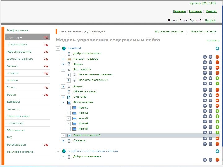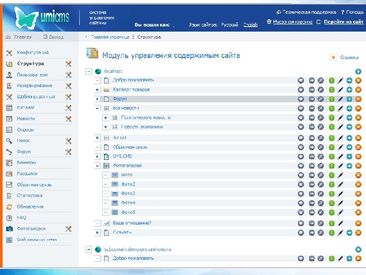 Удобство в UMI. CMS Минимум действий для типовых функций Очевидность действий для пользователя Различие интерфейсов по сложности Гибкое распределение прав Управление «drag&drop» Контроль версий каждой страницы Восстановление удаленных объектов Горячие клавиши
