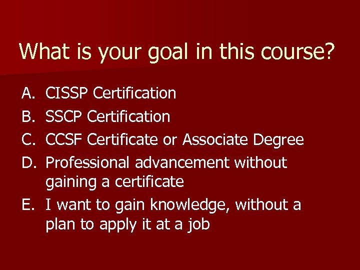 What is your goal in this course? A. B. C. D. CISSP Certification SSCP Certification CCSF Certificate or Associate Degree Professional advancement without gaining a certificate E. I want to gain knowledge, without a plan to apply it at a job