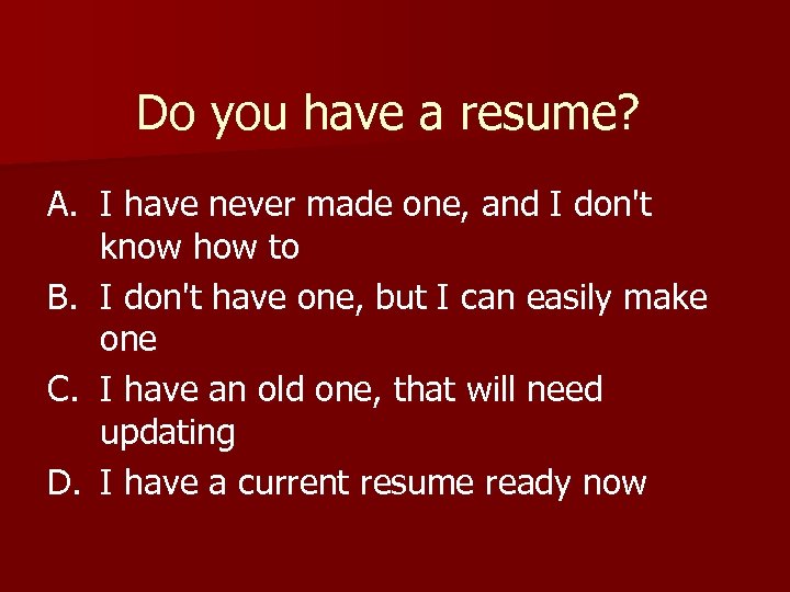 Do you have a resume? A. I have never made one, and I don't know how to B. I don't have one, but I can easily make one C. I have an old one, that will need updating D. I have a current resume ready now