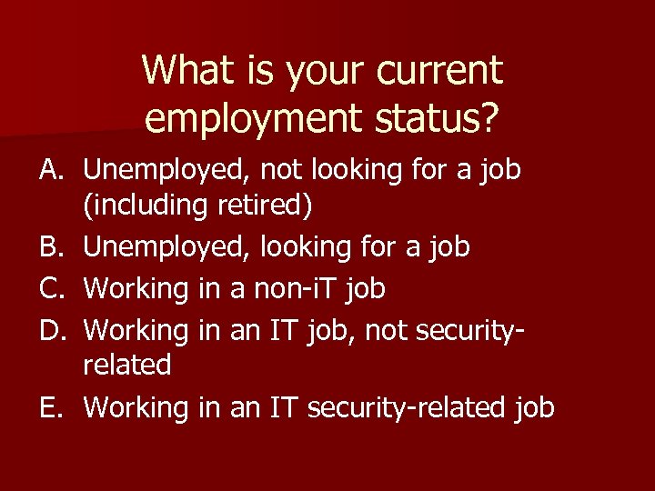 What is your current employment status? A. Unemployed, not looking for a job (including retired) B. Unemployed, looking for a job C. Working in a non-i. T job D. Working in an IT job, not securityrelated E. Working in an IT security-related job
